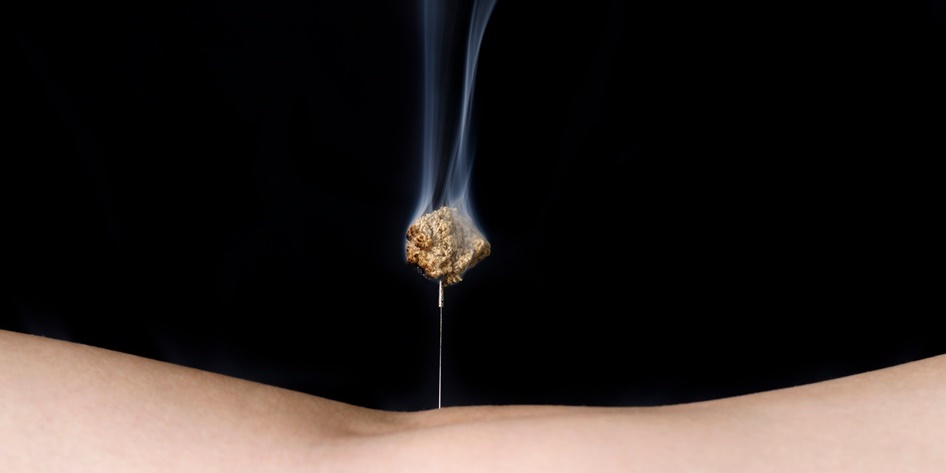 Moxa is placed on the head of the inserted needle and subsequently burned.