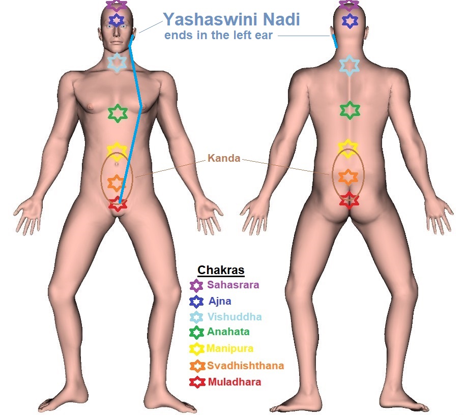 Although the ancient textual sources that mention Yashaswini are rather conflicting about its trajectory and its intermediary and ending points, it’s widely agreed upon that the Yashaswini Nadi pathway starts in the Kanda and has its endpoint in the left ear.